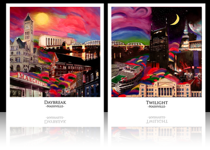 Daybreak Nashville and Twilight Nashville, inspired by the Architectural re-birth of Nashville and the Historic beginnings of this wonderful city. Artist Todd Morrison created the original Oils on Canvas as the center piece for a new Loft Apartment on Historic Church Street. The demand for a Limited Edition set of Art Prints from the Whimsical and Colorful paintings prompted Todd to release this special edition. The Edition will be Signed by the Artist and Limited to 2500 of each 17” X 19” print. Reproduced by the Artist with color and detail to faithfully represent the original Oils.